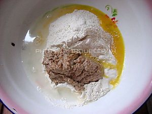 主面团:如果是冰箱冷藏发酵的中种要提前取出放室内回温。把中种面团和除了玉米油外的其他材料用手混合直到面团变得只有一点点黏手,在拌的过程中视面团的软硬程度来决定要不要加入适当的水份。我用打蛋器揉面,只要面团能一直缠绕在揉面棒上并且在刚开始3分钟的整个揉面过程里没有甩出面团就表示水量恰当了。 这次的中种水量很足够,所以做主面团时我都不用加水了。