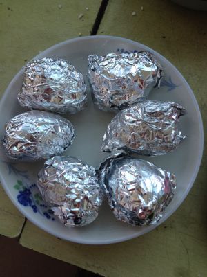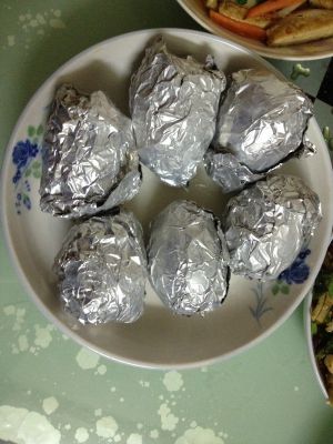 再到超市买上锡纸,选择暗的一面包住蛋,光亮的一面在外面。这样更易受热!(我是第一次用锡纸包东西,所以在网上特意搜了哈如何使用锡纸)