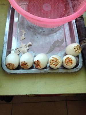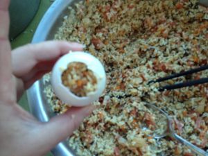 将蛋清分离出来,保留蛋黄!在用勺子将混合好的糯米塞到蛋里,网上说不要填太满,说四分之三就好啦,但我的建议就是刚刚填满就好啦!