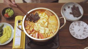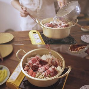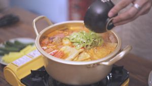 锅底铺上韩式泡菜,依次铺入备好的食材。