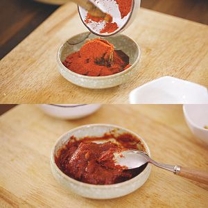 辣酱与大酱混合,加入辣椒面,搅匀待用。