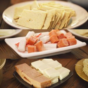 鱼饼,火腿,午餐肉,豆腐切块,蟹棒和香肠切段。
