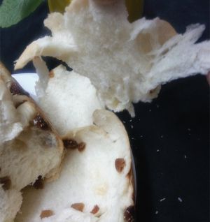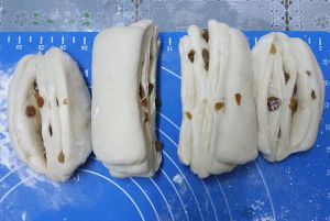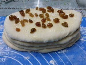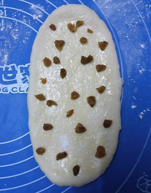 取一面团擀成椭圆,表面刷层黄油、撒上椰蓉和葡萄干粒