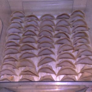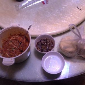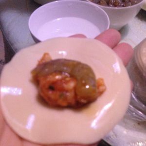 放肉馅放在饺子皮上,再放一个虾仁。搞定。