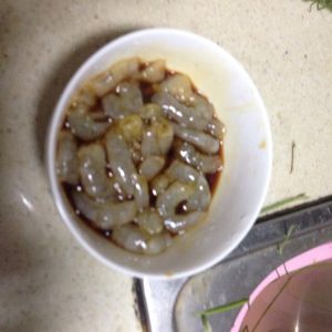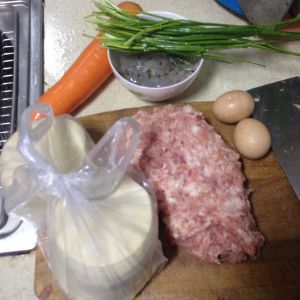 首先把猪肉剁成肉沫,再把虾子剥壳,然后把胡萝卜剁成沫。