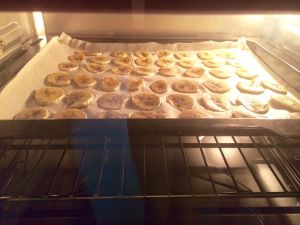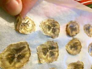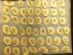 将油布或硅油纸铺在烤盘上,均匀摆好香蕉片,可再在每片香蕉片上抹一层白砂糖(利于酥脆口感,但不可太多!)。