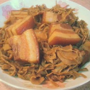 下梅菜笋干,继续煮15分钟以上。煮到汤汁略收干即可
