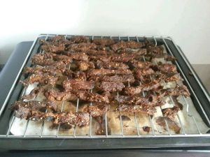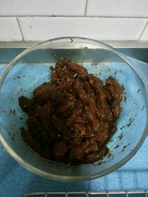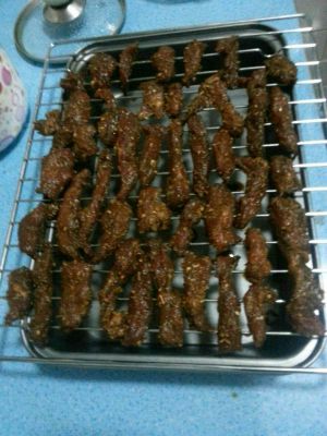 将腌好的牛肉,摆在烧烤架上,自然风干(因为是晚上做的,就直接放在窗口吹了一夜,第二天早上放到冰箱冷藏室风干了24小时,中途记得翻一下)