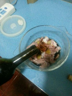 依次放入酱油,老抽,糖,红酒,腌制1小时