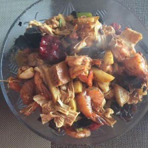 从起锅放油,油热后放入葱姜蒜炒香,然后把麻辣香锅料倒进去煸炒,放适量糖,然后把炸好的虾、土豆、木耳、腐竹、面筋放进去翻炒,再放入适量的盐、鸡精,小火煸炒到都入味了盛出就好了。
