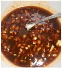 所有调料放碗里调配搅拌好(生抽2勺,醋1勺,芝麻油少许,蒜头三瓣剁碎,麻辣酱一勺)