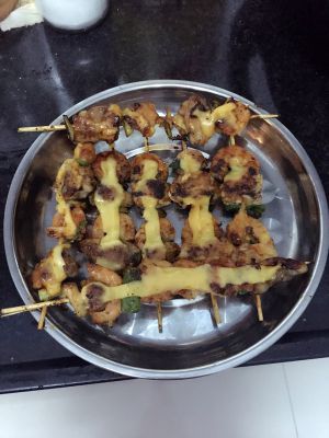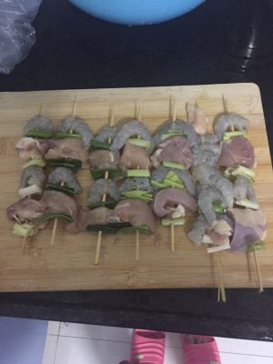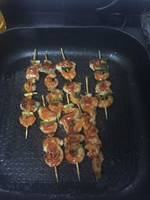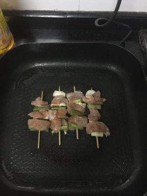 微火煎,涂上酱汁,先涂一些酱油,最后涂上一层稍厚的番茄酱