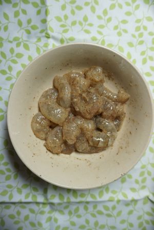 鲜虾买回来洗净去壳(一定要抽掉脏的虾肠哦)撒上胡椒粉、盐、淀粉腌制30min左右