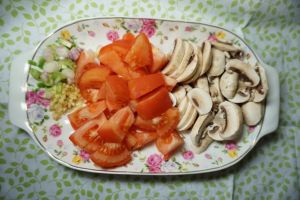 西红柿整个洗净用热水烫过以后去皮,切成块(个人喜欢切小一点好炒熟),口蘑洗干净切片,小葱切花(葱白葱绿分开,姜切丁备用