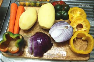 清洗处理蔬菜:洋葱切长条,椒、土豆、胡萝卜切小片。