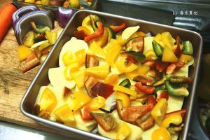 预热烤箱,220-230度,上下火,热风循环。洋葱放入模具底部垫底,上面依次放入其余蔬菜、鸡腿,浇上腌制鸡腿的酱汁。
