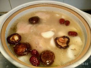 大概又炖了半小时汤汁变浓白以后,加入准备好的山药、香菇、红枣等(我是有什么加什么,各位喜欢啥随意啦)炖到山药熟烂即可享用啦!冬日滋补常被呀!哈哈