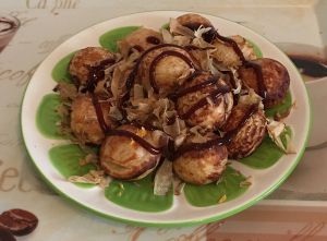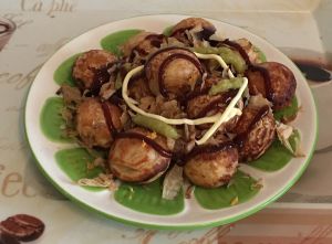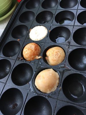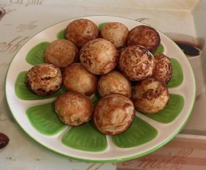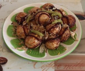 将鱿鱼须黄瓜切碎,加入面粉鸡蛋,也可以在网上买章鱼烧粉,搅成这样