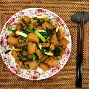 最后加入青蒜煸炒软塌,回锅肉熟透即可装盘