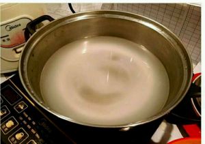 把第二遍的淘米水(记住哦是第二遍的~)倒入煮锅中,然后开火煮至沸腾。