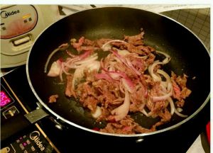 牛肉变色后放入切片的洋葱继续翻炒,炒香后加入一勺韩国大酱(或豆瓣酱)翻炒片刻后出锅。