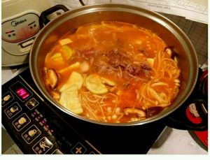 沸腾后,放入大蒜和之前炒好的牛肉,大火煮五分钟即可。注意不要煮太久哟,土豆会煮烂,蛤蜊的话可以在放牛肉后放入,可惜没有买到蛤蜊,所以就没有放。