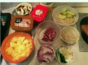 加入酱后,第一次煮沸的时候倒入土豆,第二次水煮沸的时候放入豆腐,豆芽,西葫芦,再次煮开的时候放入香菇和金针菇。