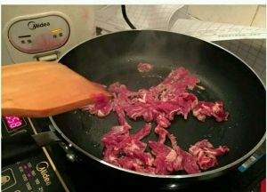倒适量食用油(橄榄油最佳)入锅,油热后倒入事先切好的牛肉翻炒片刻,变色即可。