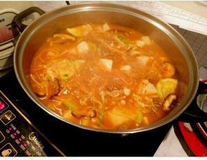 淘米水煮沸后往里面加入2勺韩国大酱,2到3勺韩国辣椒酱,搅拌至溶解。