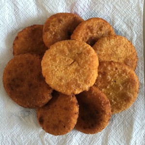 压成饼!加入油锅炸至金黄捞出!(小火慢慢炸)