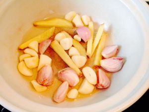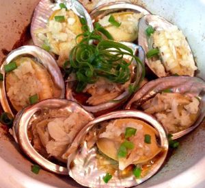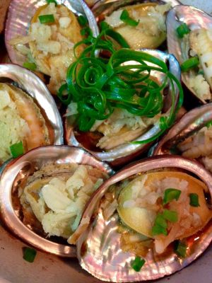 放入鲍鱼,表面撒少许盐、蒜末,大火盖盖、焗三分钟。