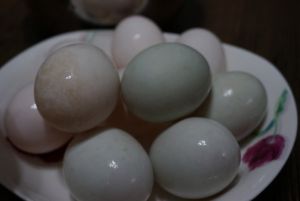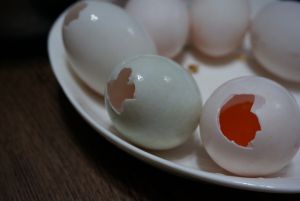 将鸭蛋小角的那端敲小洞,把蛋白倒出,只留蛋黄