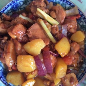 热锅下花椒,加油,花椒变色后取出,放入冰糖,炒化后放入鸡块翻炒,加入调料一起炒,变色后加热水煮开放入土豆,快收干后加入西红柿和洋葱,最后撒入葱花,出锅
