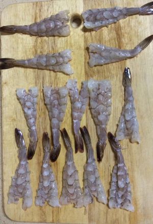 鲜虾洗净,去头,去皮,去虾线,用刀从虾腹部切开一半,一定不要完全切通。平铺在案板上。我没有用擀面杖处理,所以炸完的虾样子不美观。