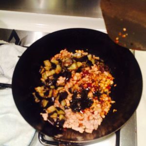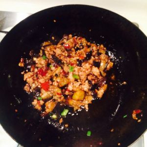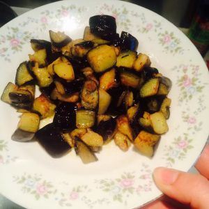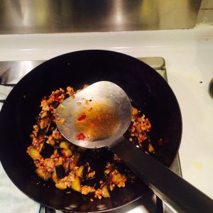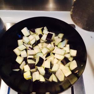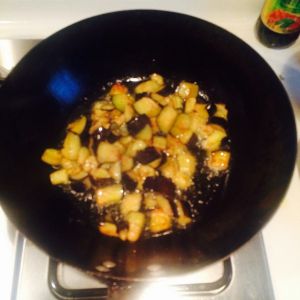 炒至茄丁表面出现金黄色后捞出备用。锅中留底油。