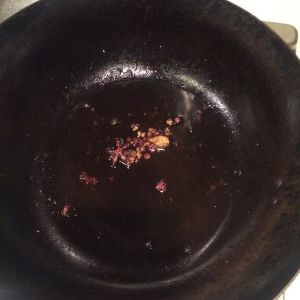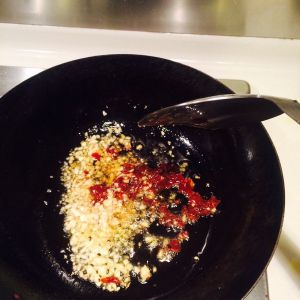 用小火在花椒油里放入豆瓣酱、姜蒜,炒出香味,