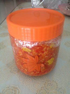 最后将搅拌好的辣椒酱放入玻璃瓦罐器皿。封口处贴上保鲜膜盖紧。存放于阴凉处。几天以后就可以实用了!(当然时间越久越好吃)