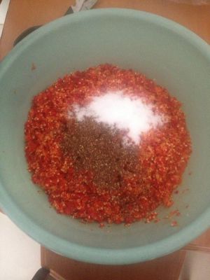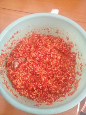 表面凉干后,将辣椒、姜、蒜、花椒一起捣碎。(根据喜好 切的大小可以自己随意,此过程手最好不要乱摸 哈哈。当然也可以使用搅拌榨汁机 效率快)
