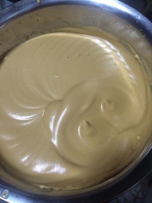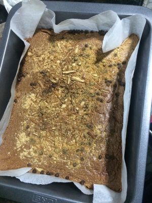 将除了巧克力豆、可可粉、黄豆粉外的东西混合,左右上下拌匀,与蛋白糊混合拌匀,倒入垫了油纸的烤盘中。