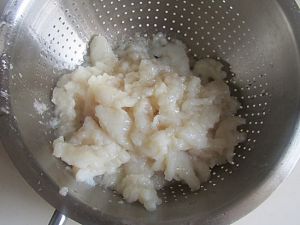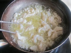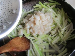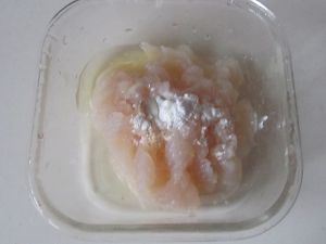 将解冻后的龙俐鱼柳切成细丝,加入盐,白胡椒, 生粉和半个蛋清腌制;