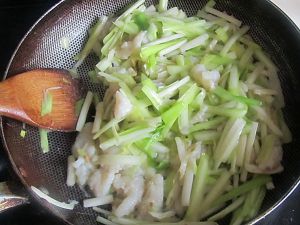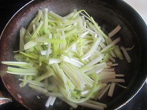翻炒出香味后加入韭黄翻炒, 翻炒一下后加入一点盐调味;