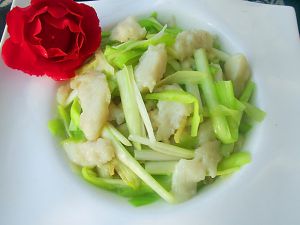 韭黄翻炒到刚软的时候就下入刚滑好的龙俐鱼柳, 翻炒;