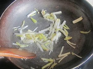 在锅中烧少许油, 加入姜丝和大葱丝翻炒;