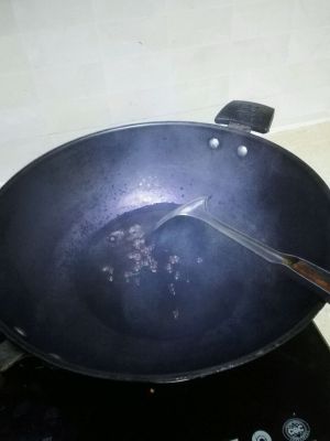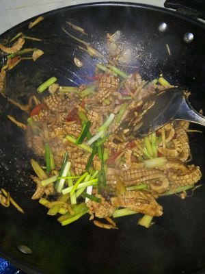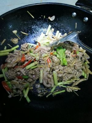 将腰花放进去炒至有点卷曲开花状时加入芹菜继续翻炒