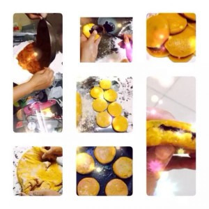 取出准备好的红豆沙,一般大型超市都可以买得到的,放在饼的中间,然后再包回来搓圆压扁就可以了,记住尽量不要让红豆沙露出来