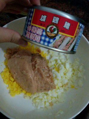 如果是水浸或橄榄油浸的金枪鱼,就把鱼抓干再加入千岛酱或沙拉酱。