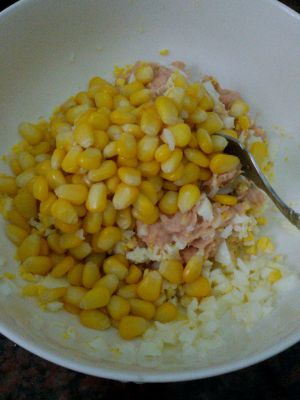 玉米粒刚从水中捞出来的话,要晾干水才能放入,因为金枪鱼罐头本身就有水分,水分太多难捏成形。除了玉米粒还可以放其他蔬菜瓜,切成小粒,灼熟就可以。