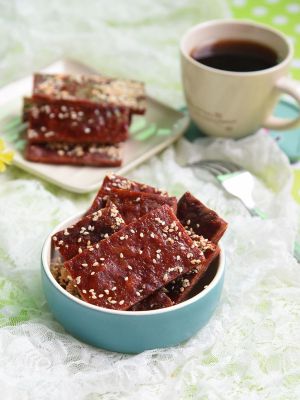 将肉馅翻面放在烤网上,扫一层蜂蜜水,撒上白芝麻,再放入烤箱中层,烘烤15分钟,烘烤好后取下肉脯放凉后,切片即可。