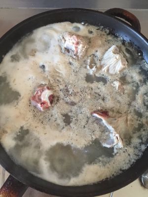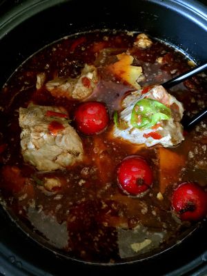 将飞水后的羊蝎子和炒好的辅料加水入电锅,我加了几颗红果,料酒 盐 花椒 糖 老抽,然后放到“炖”那档,时间是两小时