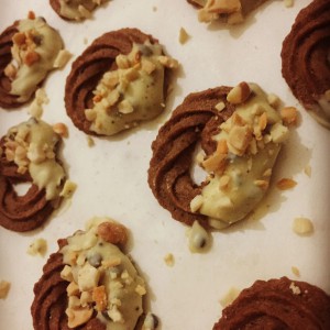 装饰部分:白巧克力融化 烤好的曲奇凉后站上白巧克力液 再撒上花生碎 花生碎是我用烤好的花生后装入袋中打碎